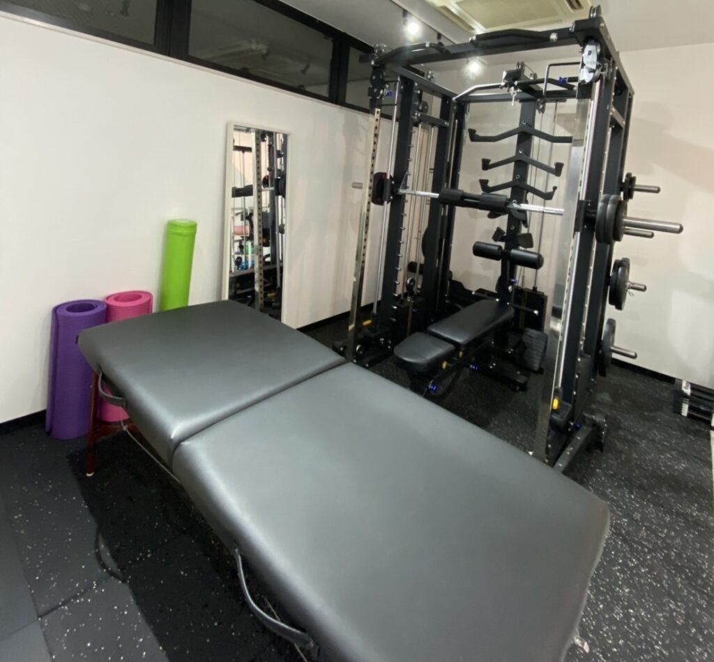 伊勢原店には、パーソナルジムとしては珍しい**「施術ベッド」を完備**しています。 「いきなり激しい運動をするのは怖い」という方でも大丈夫。まずはプロのトレーナーが、ストレッチや筋膜リリースで体の歪みを整え、コリをほぐす「コンディショニング」から行います。体が軽くなってからトレーニングに入るので、効果が違います!